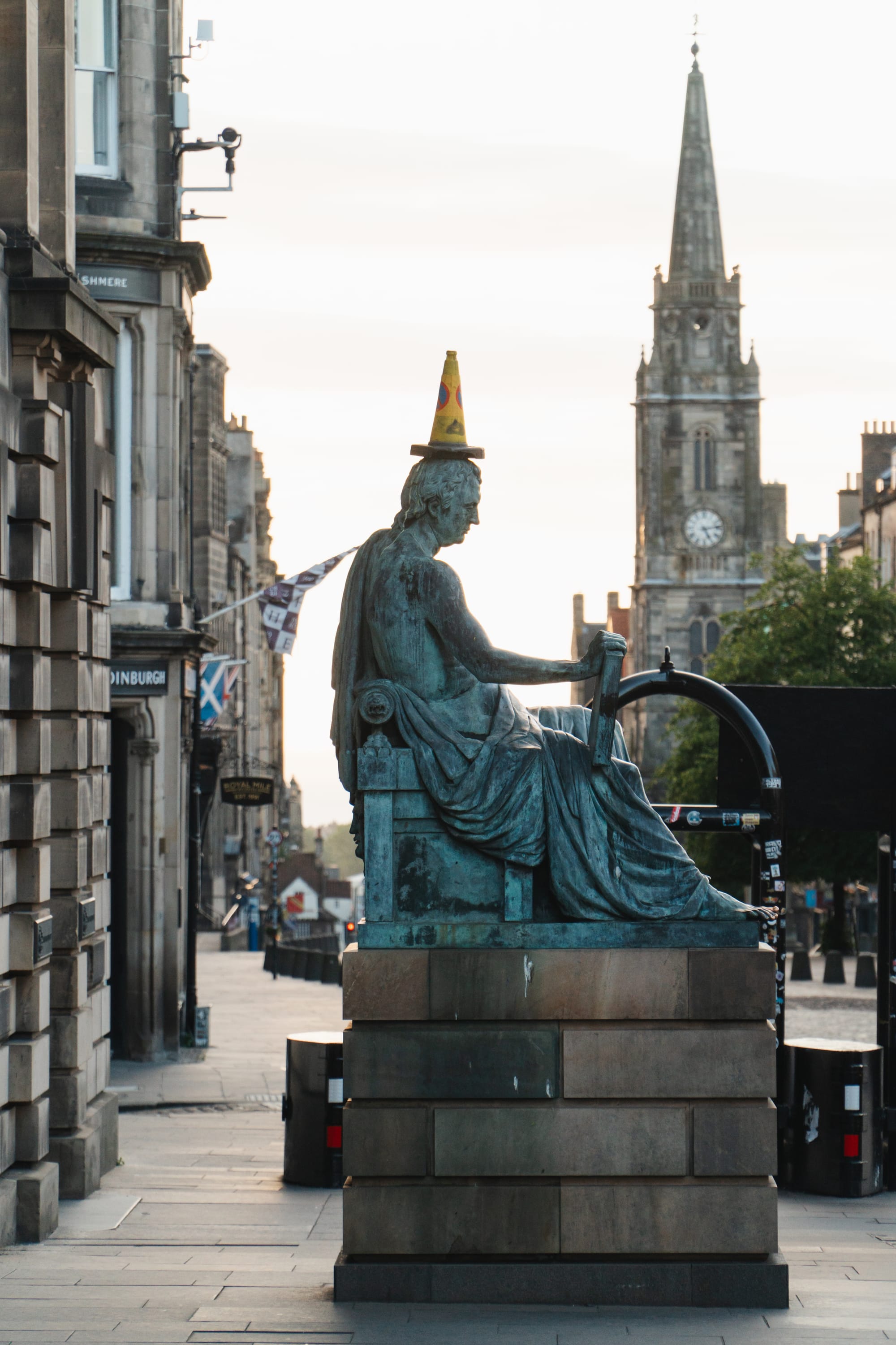 There is a distinct tranquility and aesthetic appeal enjoying a place before it awakens; for those who choose to rise early, the experience is particularly rewarding. Whether walking in a park, along a river, or on a beach, such moments are remarkable, but in one of the world's most beautiful ancient capitals, the effect is truly striking. As I proceeded past St. Giles’ Cathedral along High Street and the Royal Mile, I encountered the impressive bronze statue of philosopher David Hume, notably adorned with a traffic cone, evidently placed as a humorous gesture by a passerby. The opportunity to explore Lady Stair’s Close and Makar’s Court without crowds, free from the need to compete for space or photo opportunities, was genuinely enlightening.