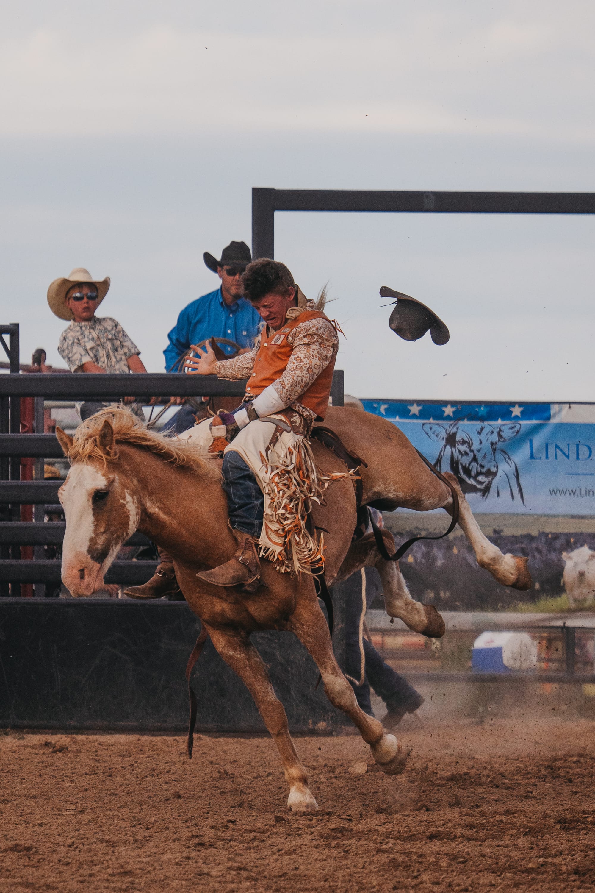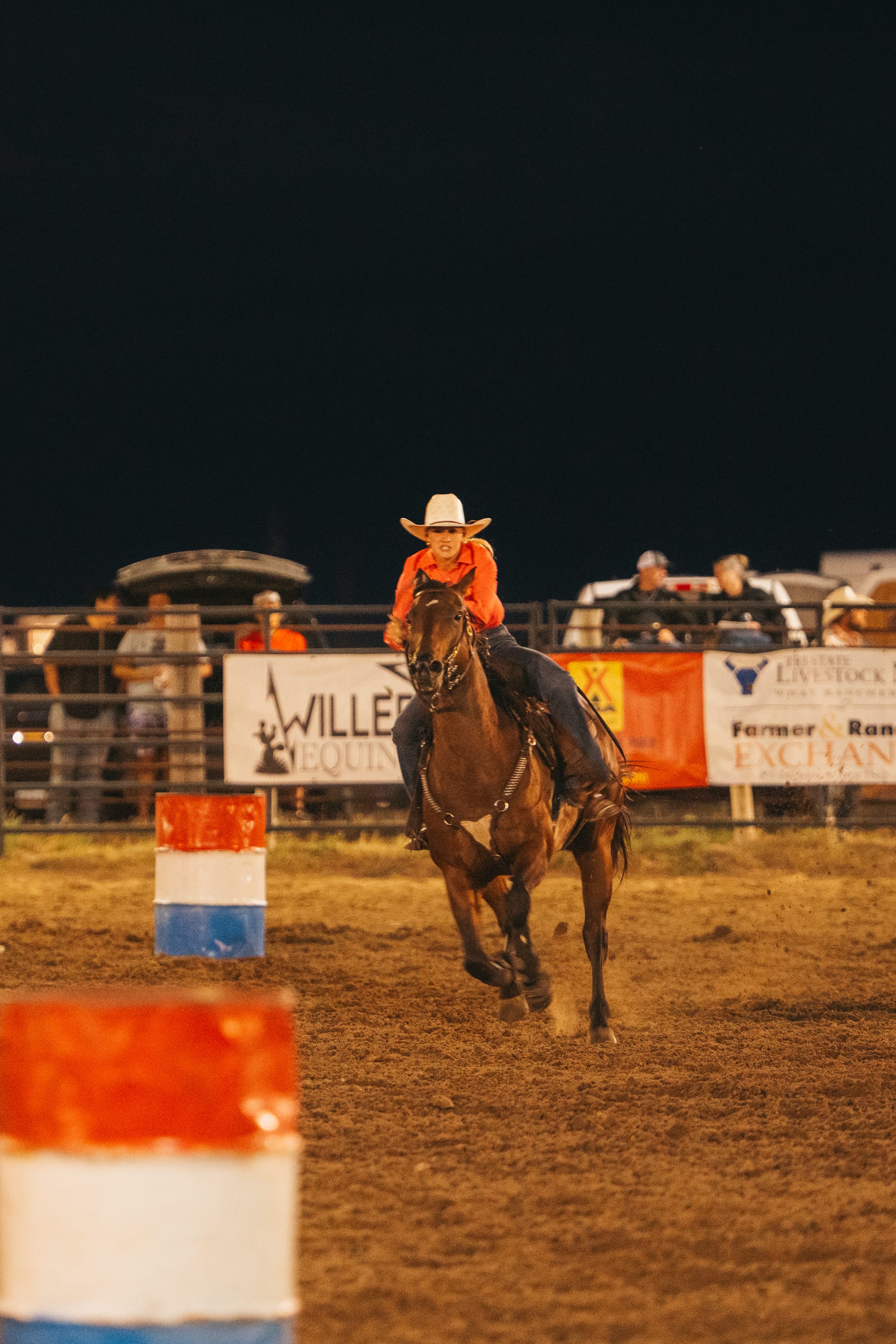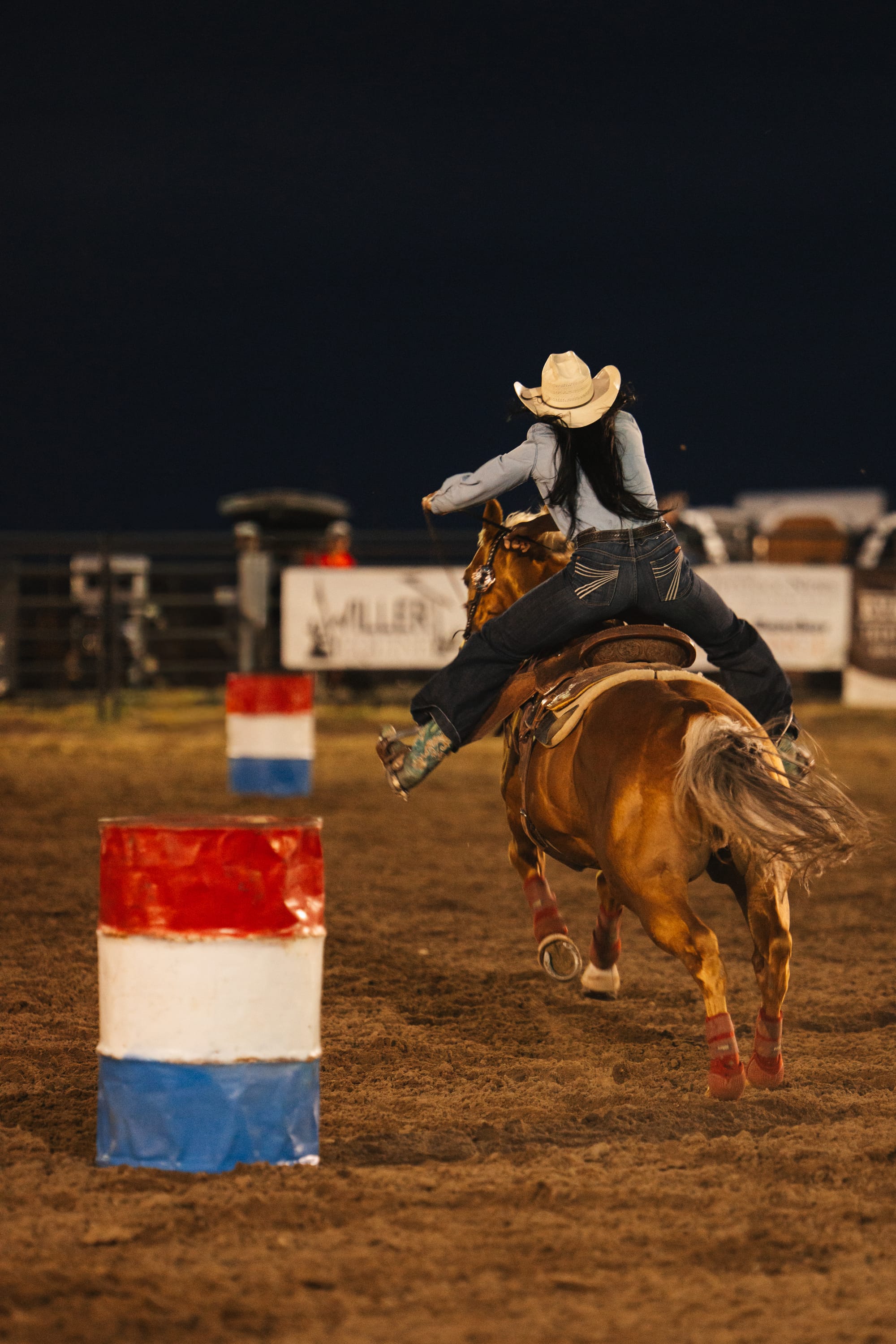 With the sun fully set, the mountains disappear and more stars than I’ve ever seen start popping out, the cowgirls take over the arena. Instead of attempting to hold onto unruly animals, barrel racing and breakaway roping are the names of the game. These women race on the backs of highly trained horses at breakneck speed, make a 90-degree angle pivot, complete a figure-eight, continue up the arena tying a bow on the run and sprint to the finish. All the competitors were within 64/100s of a second between first and eighth place, Emilee Pauley, a local to the Black Hills, took the win at 17.37 seconds.