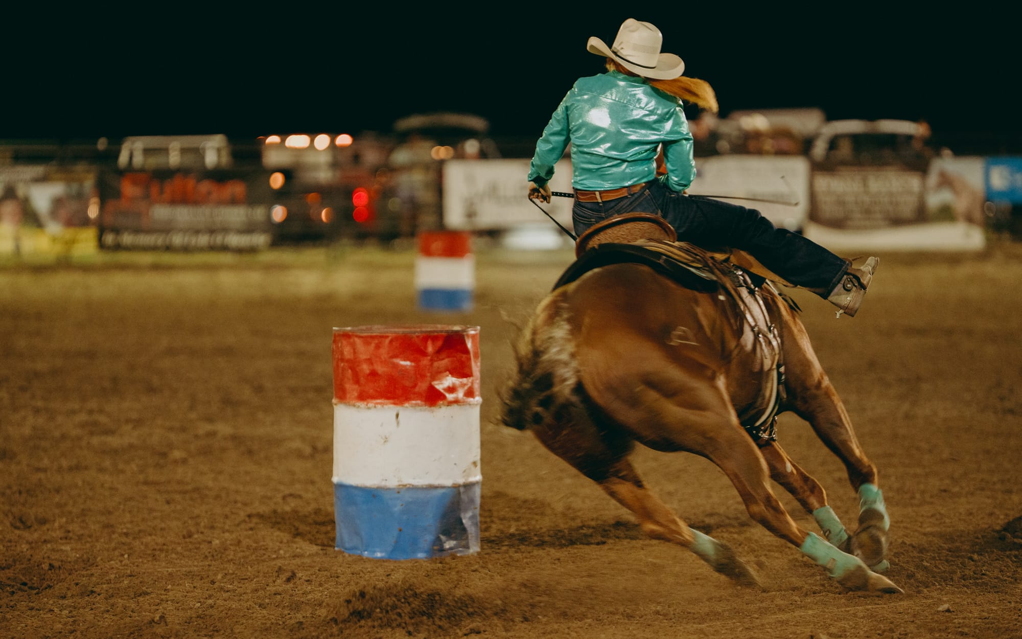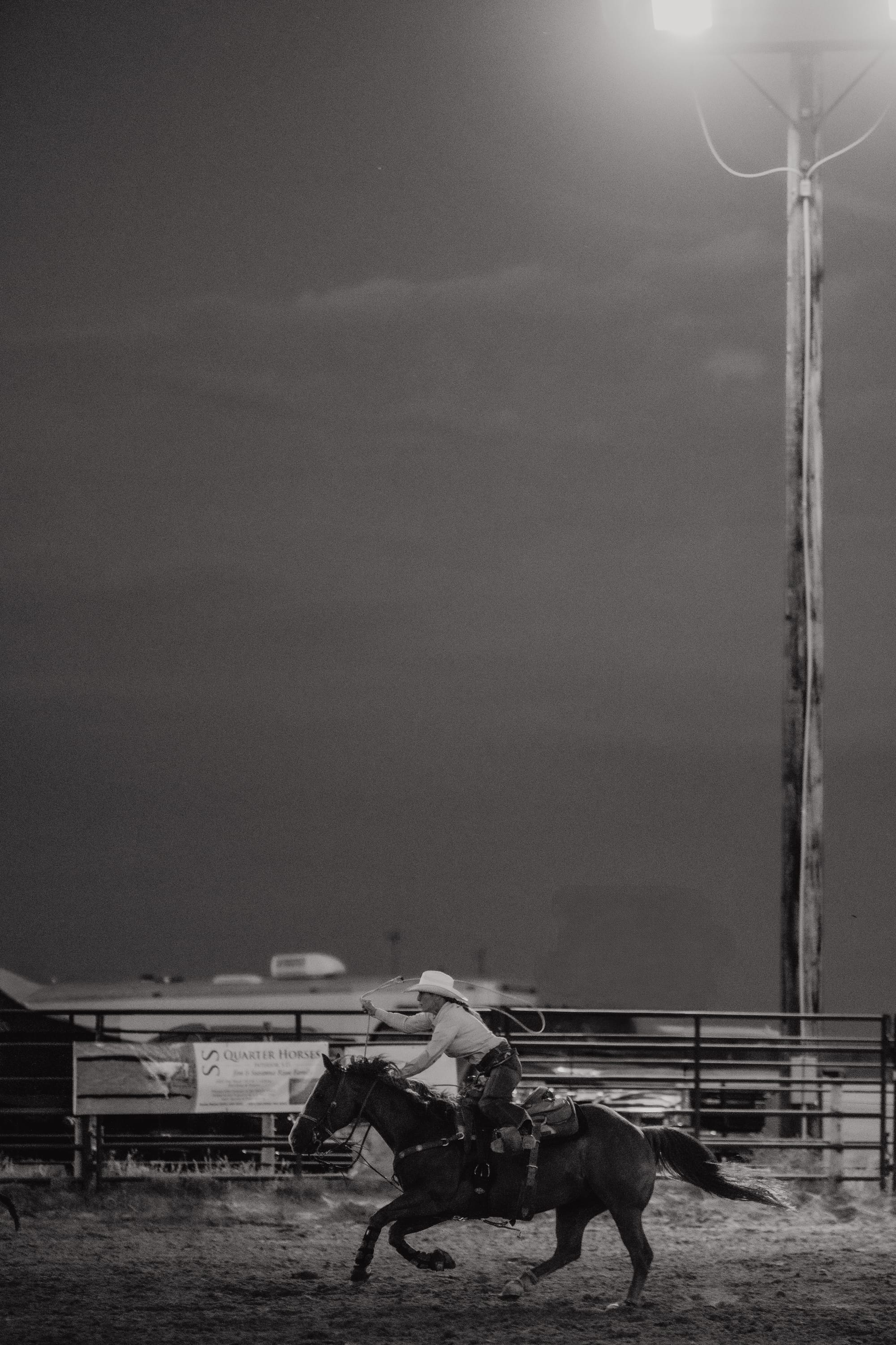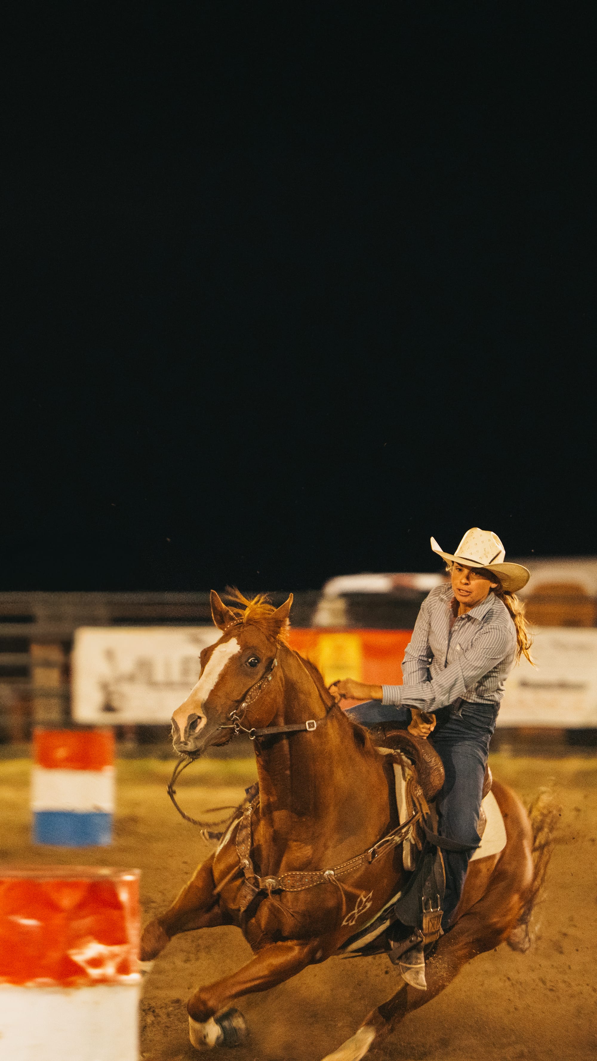With the sun fully set, the mountains disappear and more stars than I’ve ever seen start popping out, the cowgirls take over the arena. Instead of attempting to hold onto unruly animals, barrel racing and breakaway roping are the names of the game. These women race on the backs of highly trained horses at breakneck speed, make a 90-degree angle pivot, complete a figure-eight, continue up the arena tying a bow on the run and sprint to the finish. All the competitors were within 64/100s of a second between first and eighth place, Emilee Pauley, a local to the Black Hills, took the win at 17.37 seconds.