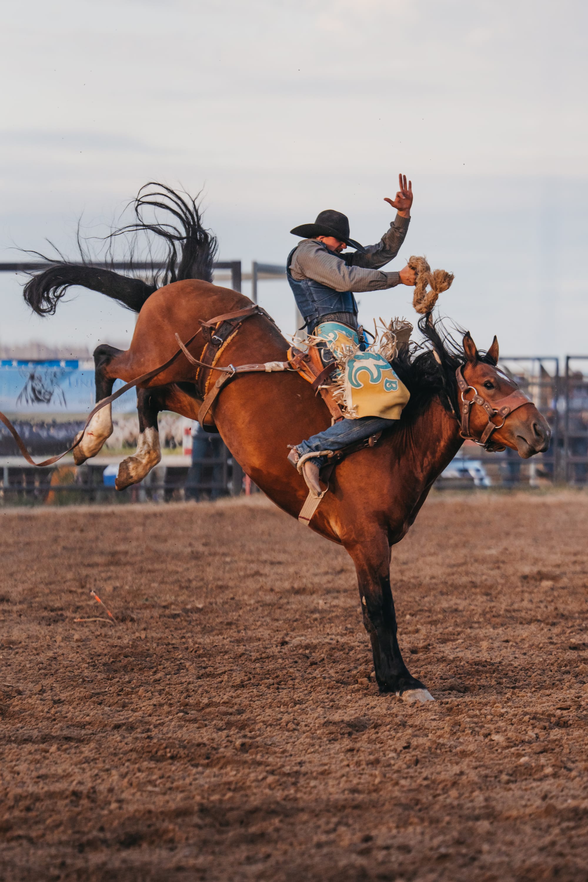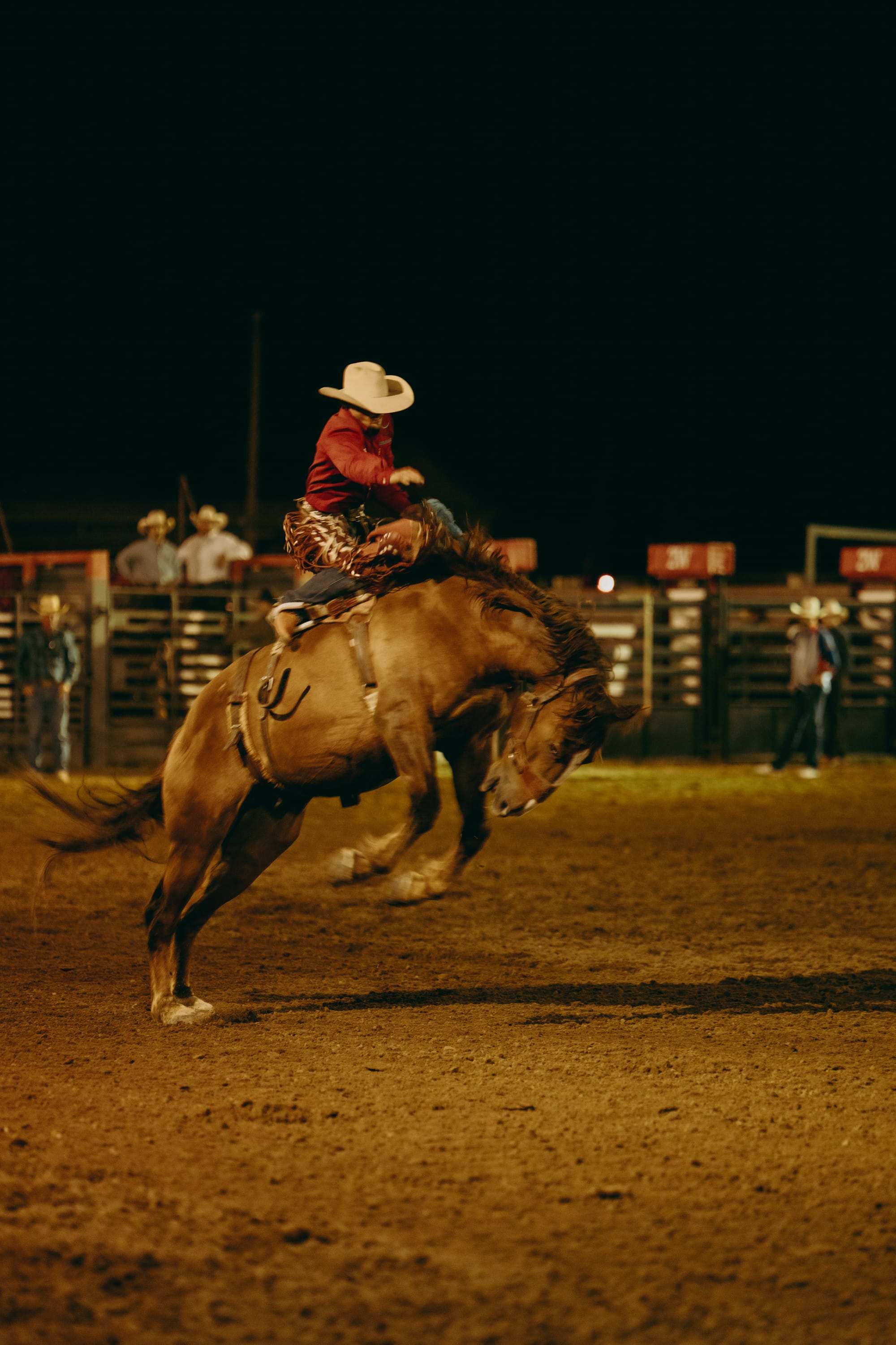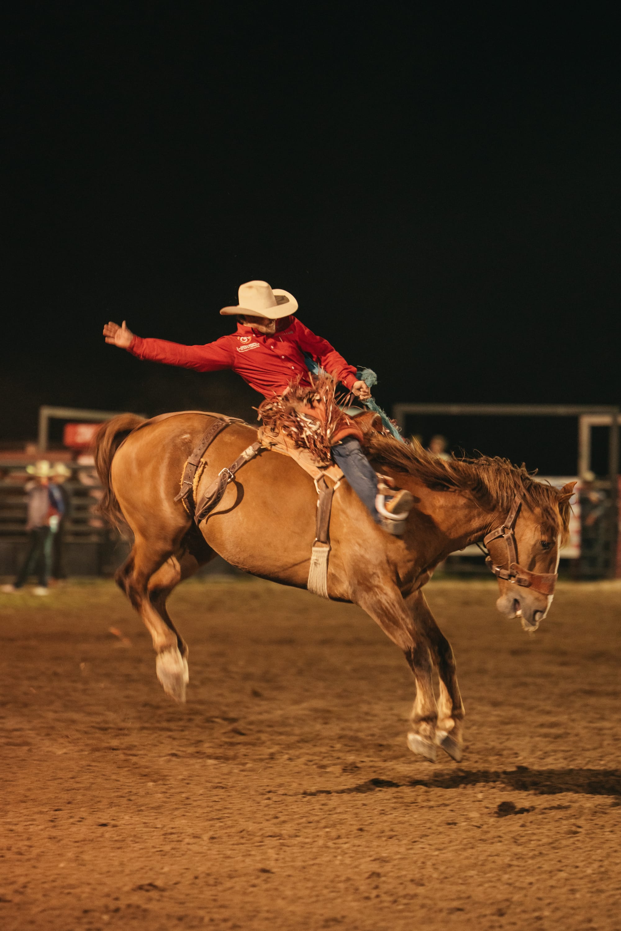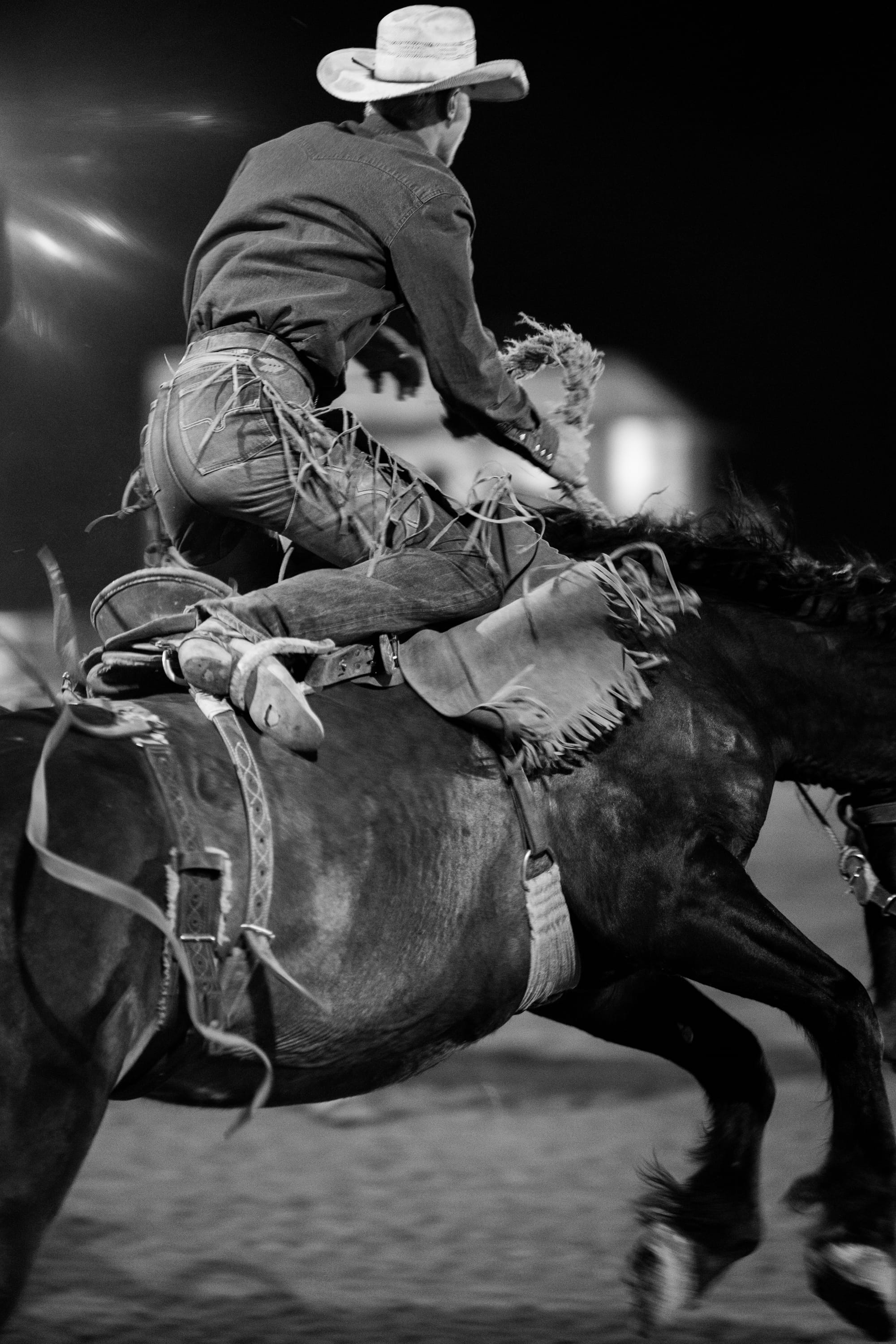 The first event of the evening is rookie bare-back bronco riding. Both the riders and horses are inexperienced, although only the rider is aware of the situation. The broncos responded differently to having a human on their back for the first time: some began bucking on their hind legs, as if they took notes of older horses’ tactics, others leapt into the air with all four hooves off the ground, and one attempted to run toward the mountains to the South of the arena before encountering the edge of the arena and then started bucking forcefully. Kyle Bloomquist, from Raymond, Minnesota, won the night on a horse named Hot Mocha.