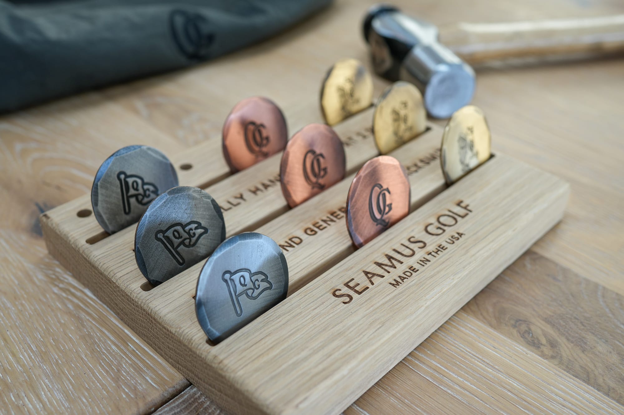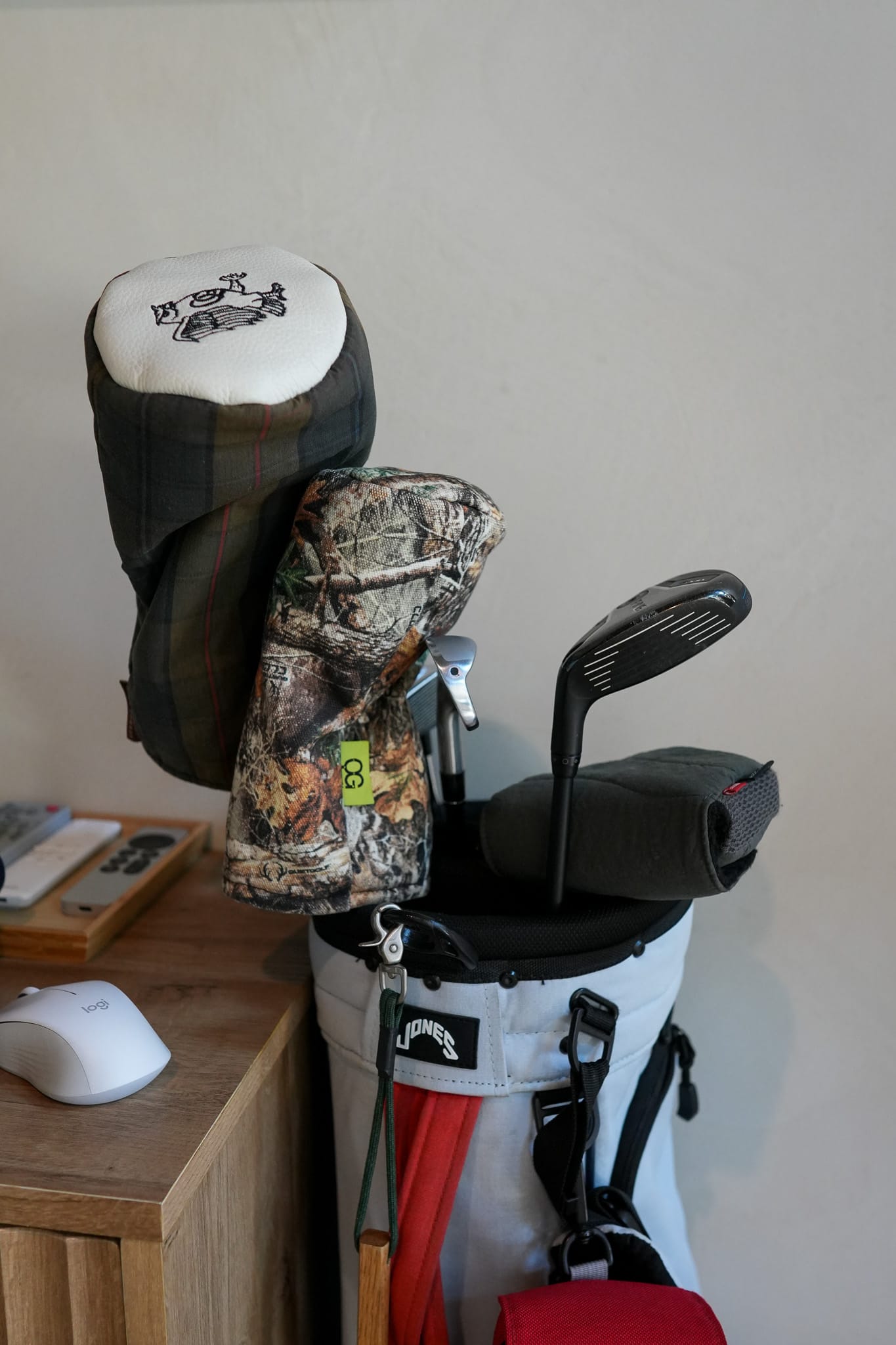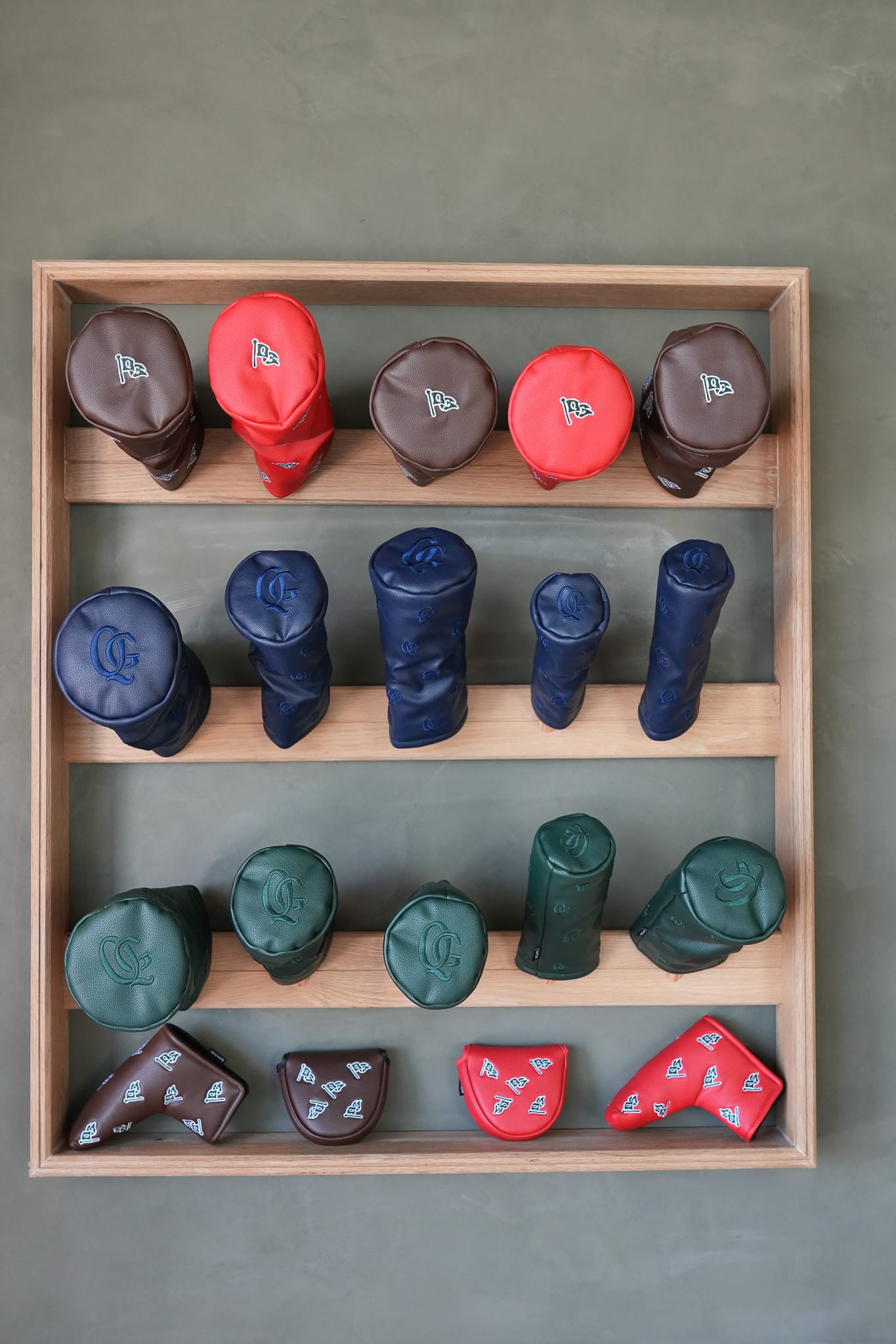 One wall holds the headcover range in a custom oak shadowbox, painted sage behind it.