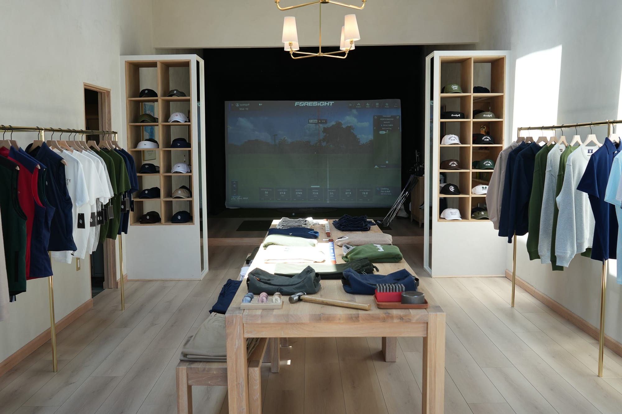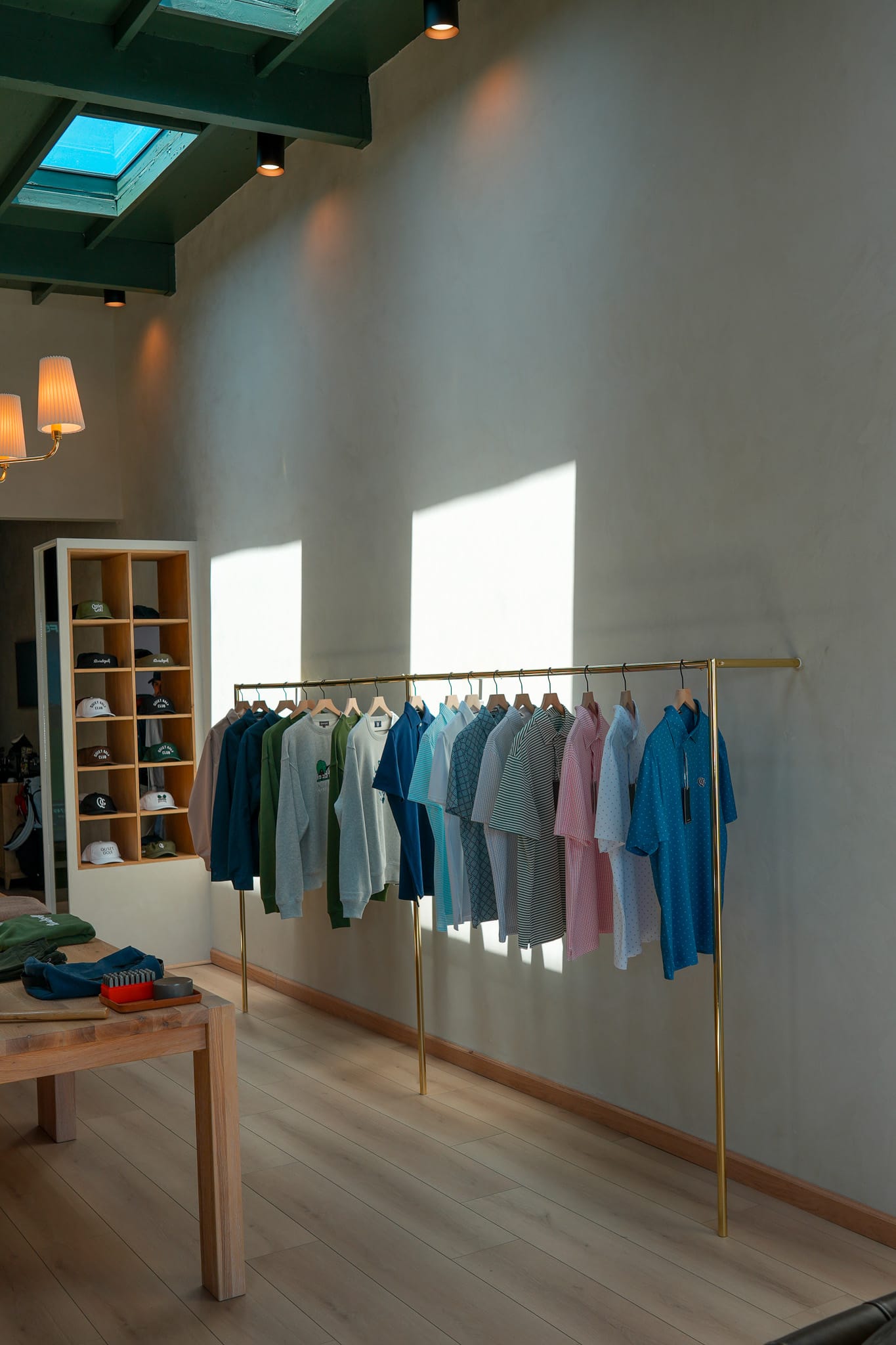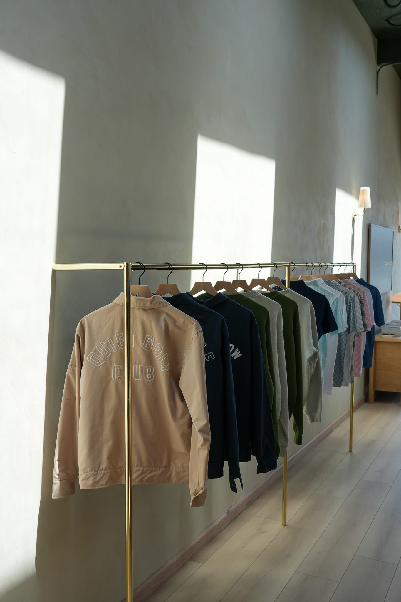 The pieces on the racks — polos in slate blue and olive, knits in forest green and navy, a coach jacket with Quiet Golf Club arced across the back — don’t shout. They sit on brass rails in the morning light and wait for you to come to them.