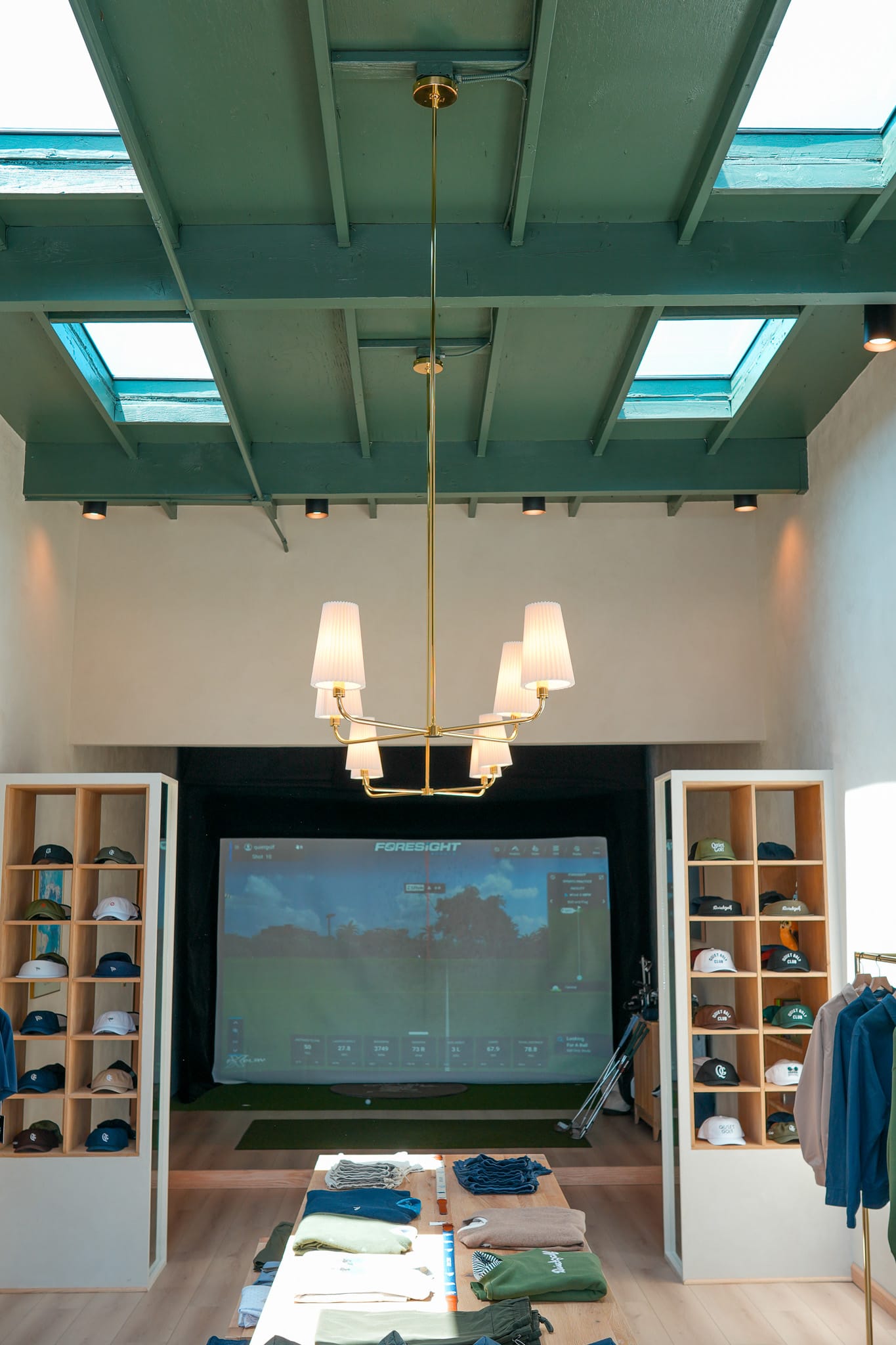 A Foresight simulator sits against the back wall. The brass chandelier overhead hangs low enough that you notice it before you notice the ceiling.