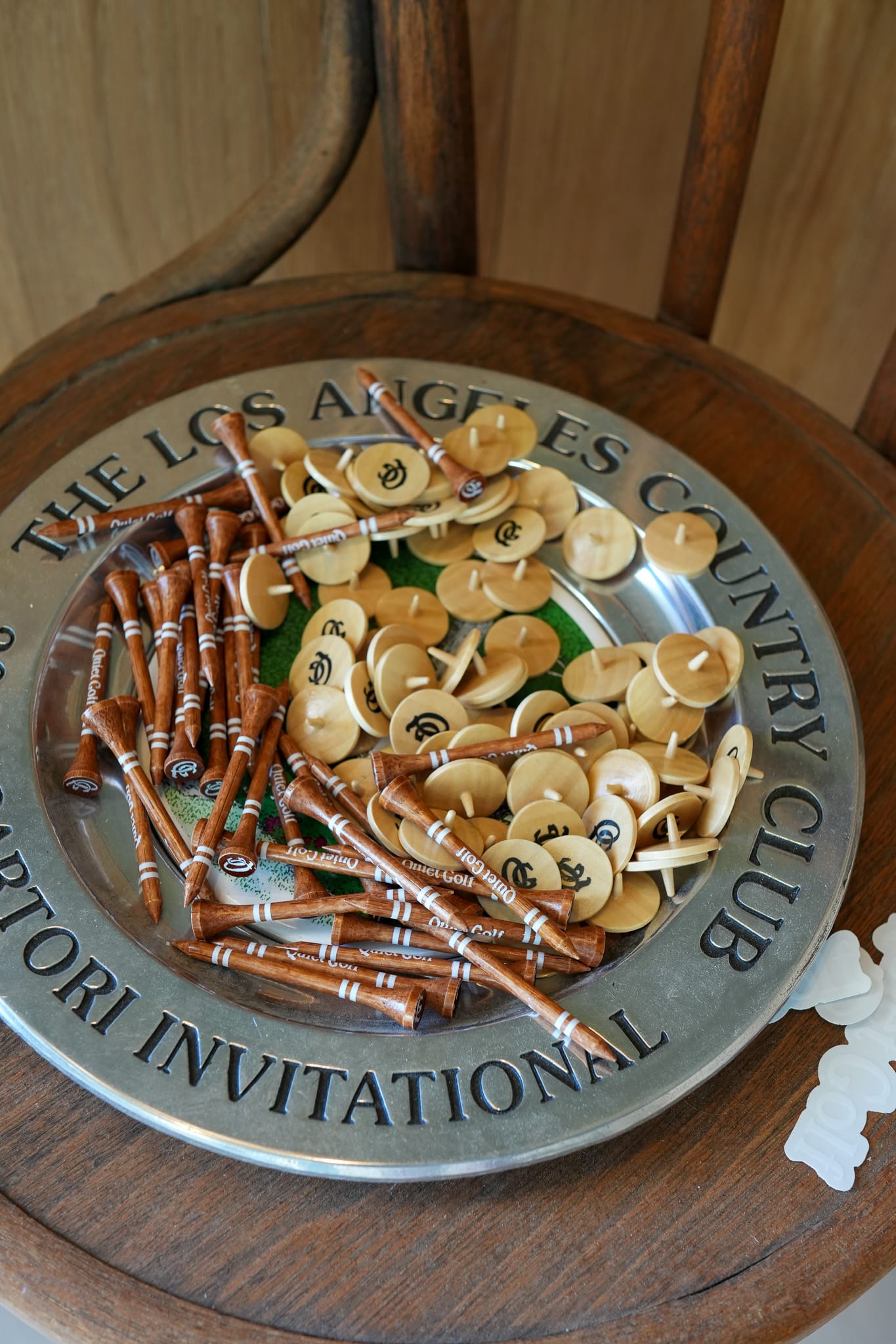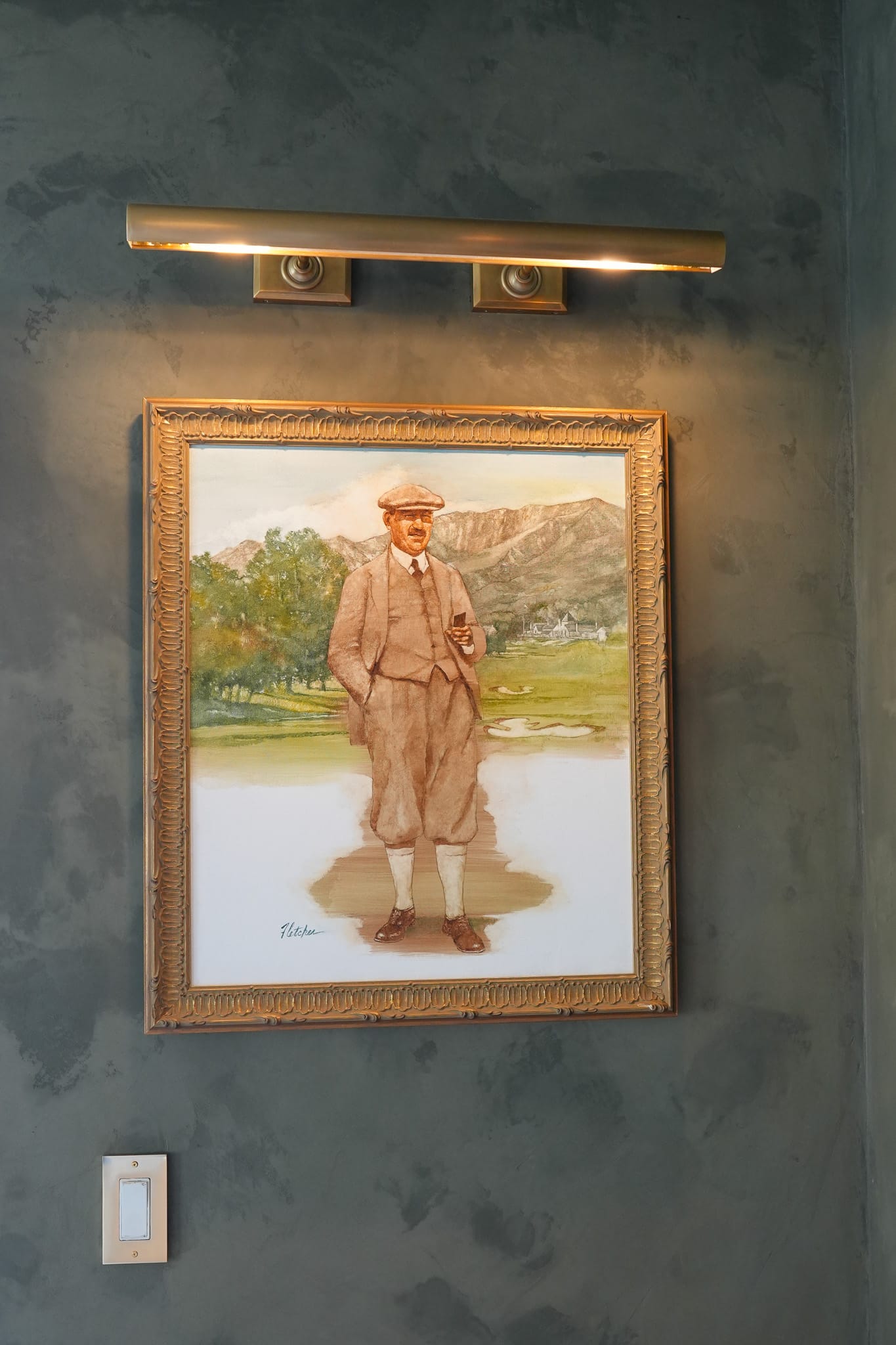 Near the entrance sits a vintage LACC tray filled with tees and ball markers. Above it hangs a watercolor under a brass picture light — a golfer in plus-fours and a flat cap, mountains behind him that could be Montecito.