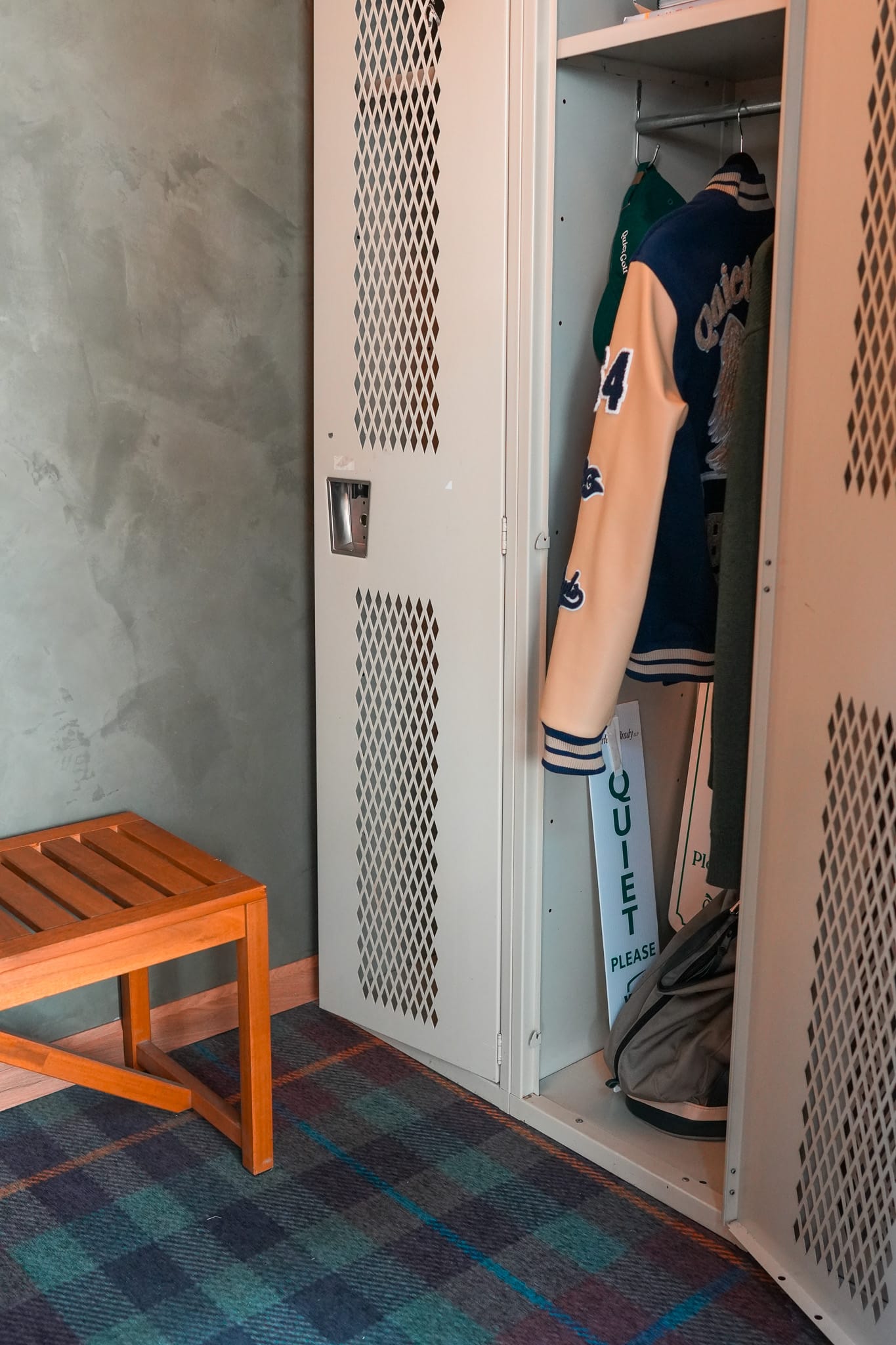 Down a short corridor is a locker room. Real vented metal lockers. Tartan carpet.
