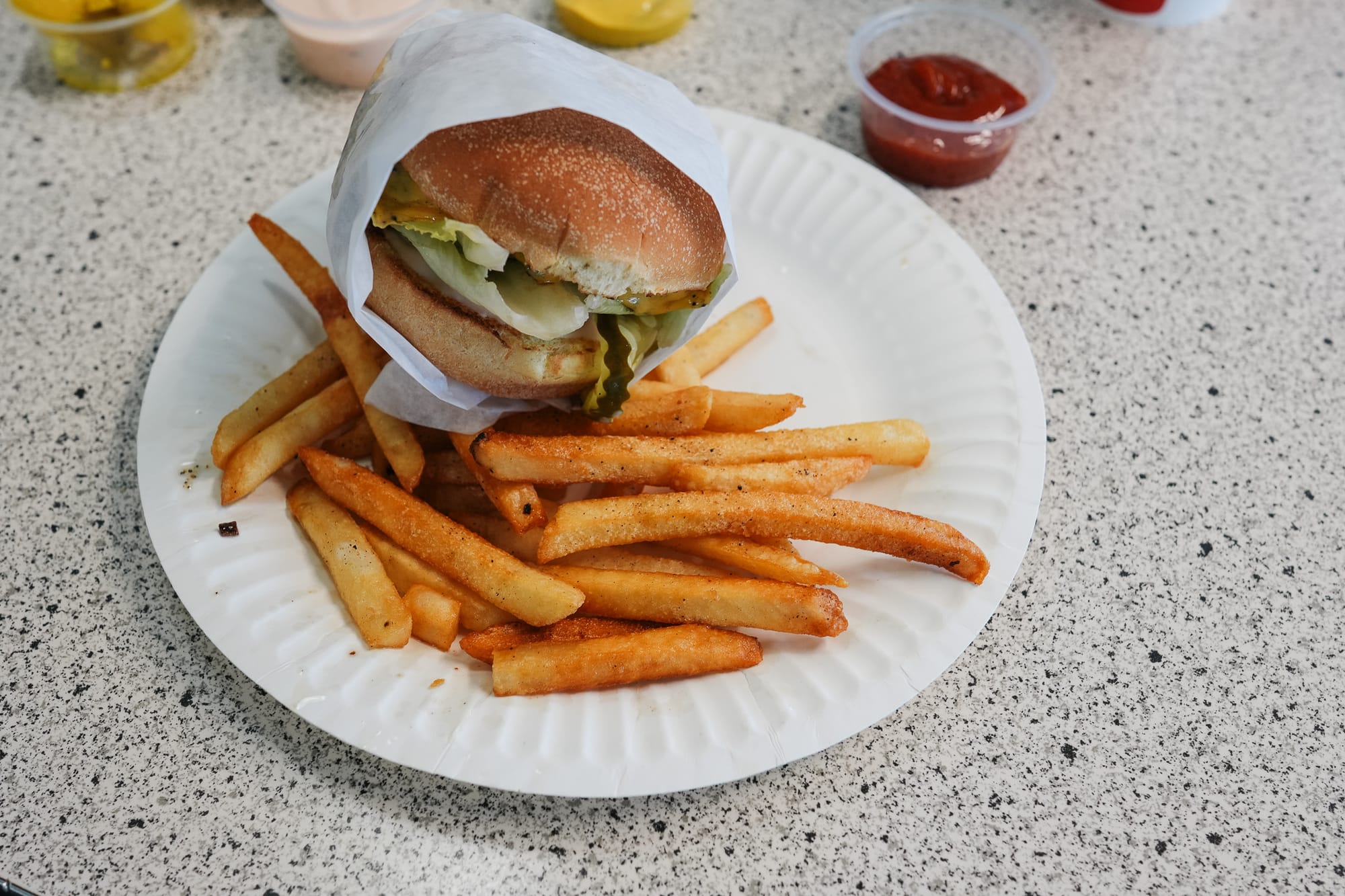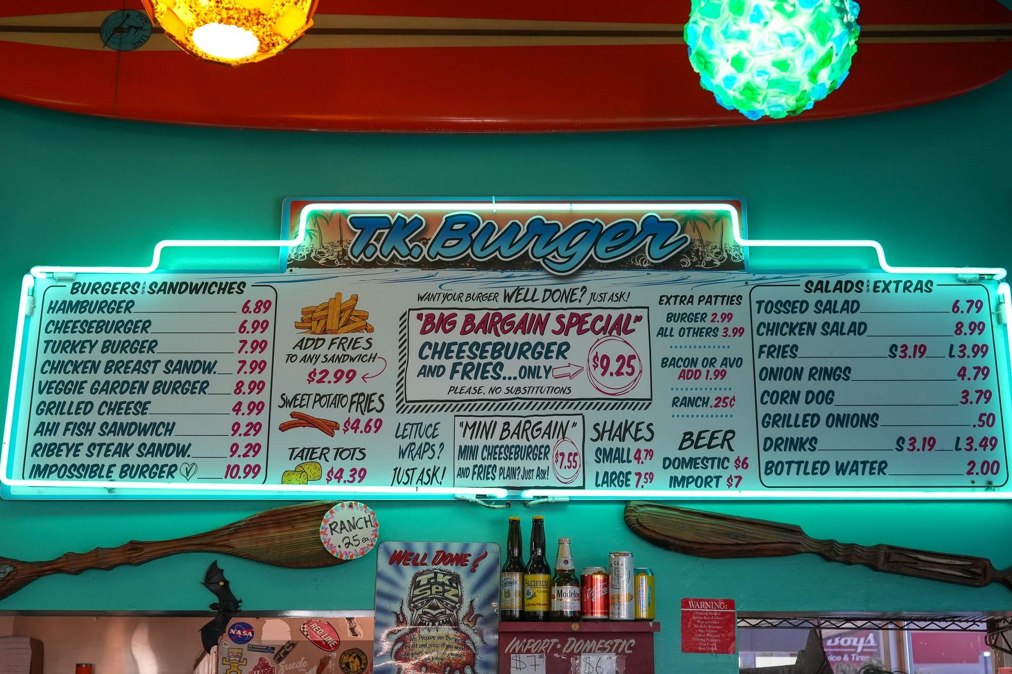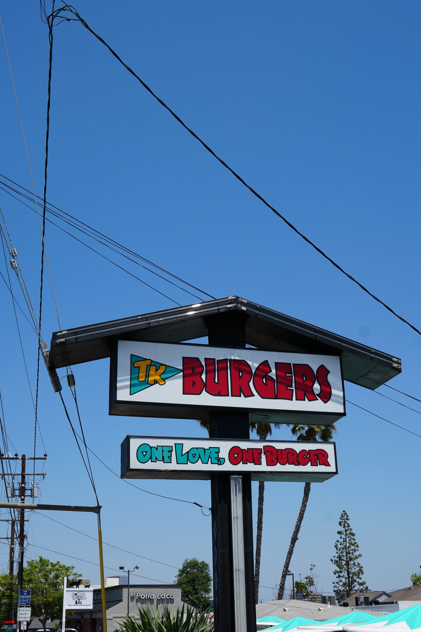 After we chatted for a bit we headed to TK Burger round the corner. The sign out front says One Love, One Burger. Inside: a milkshake mixer that looks older than anyone working there, a framed black-and-white photo of the original location on the wall, a laminated menu that hasn’t needed updating.