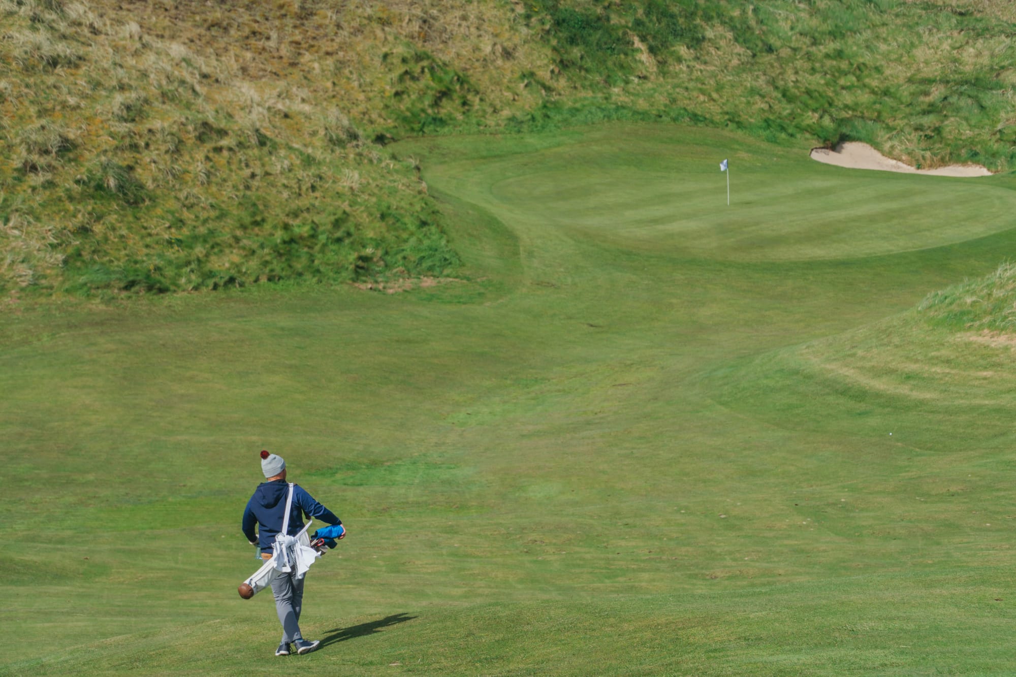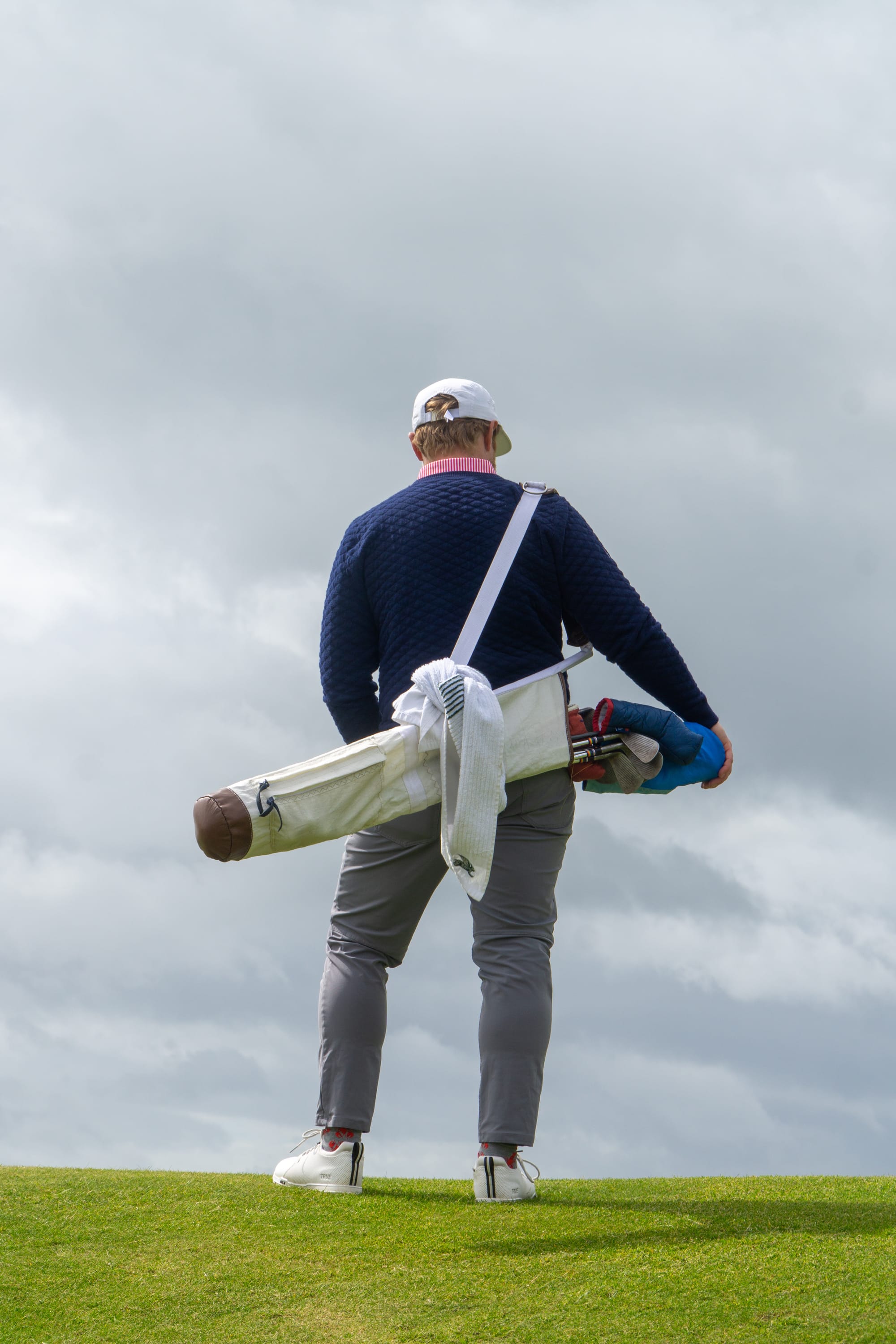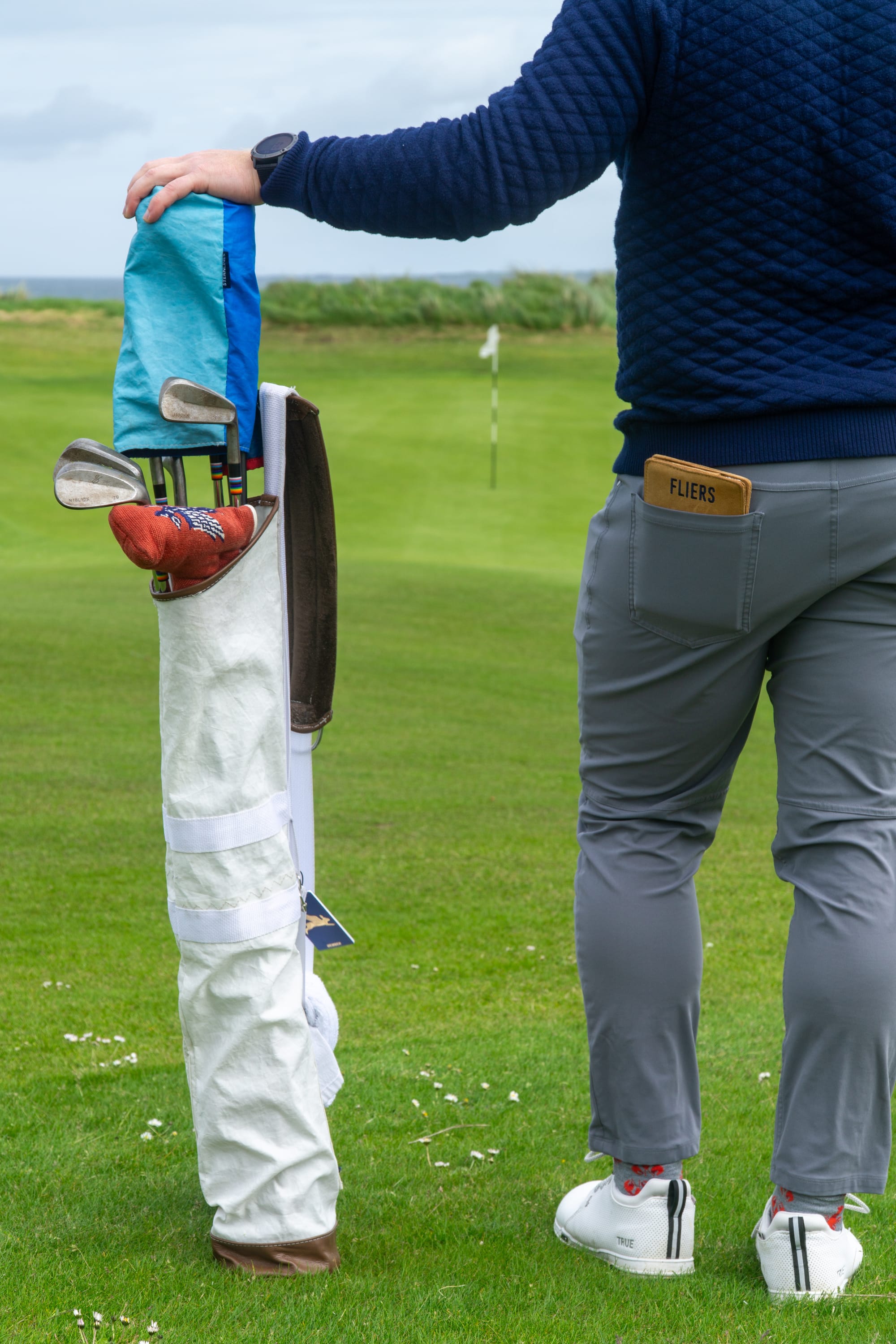 One of those ideas was a lightweight, slim golf bag made from sails. I’ve used a half set of clubs for years and wanted something smaller and lighter than what was available. Sailcloth was the perfect material. Mike sketched out designs, and my friend Zac and I tested the first prototypes on a trip to Western Ireland. We carried those bags from Dublin to Rosapenna, Belmullet, and Ballybunion. Caddies lit up when they saw our half-set bags, knowing their day just got a little easier. The bag was named after Fergus Kearney, the superintendent at Carne Golf Club in Belmullet. We returned with feedback, adjustments to zippers and straps, but every review was glowing.