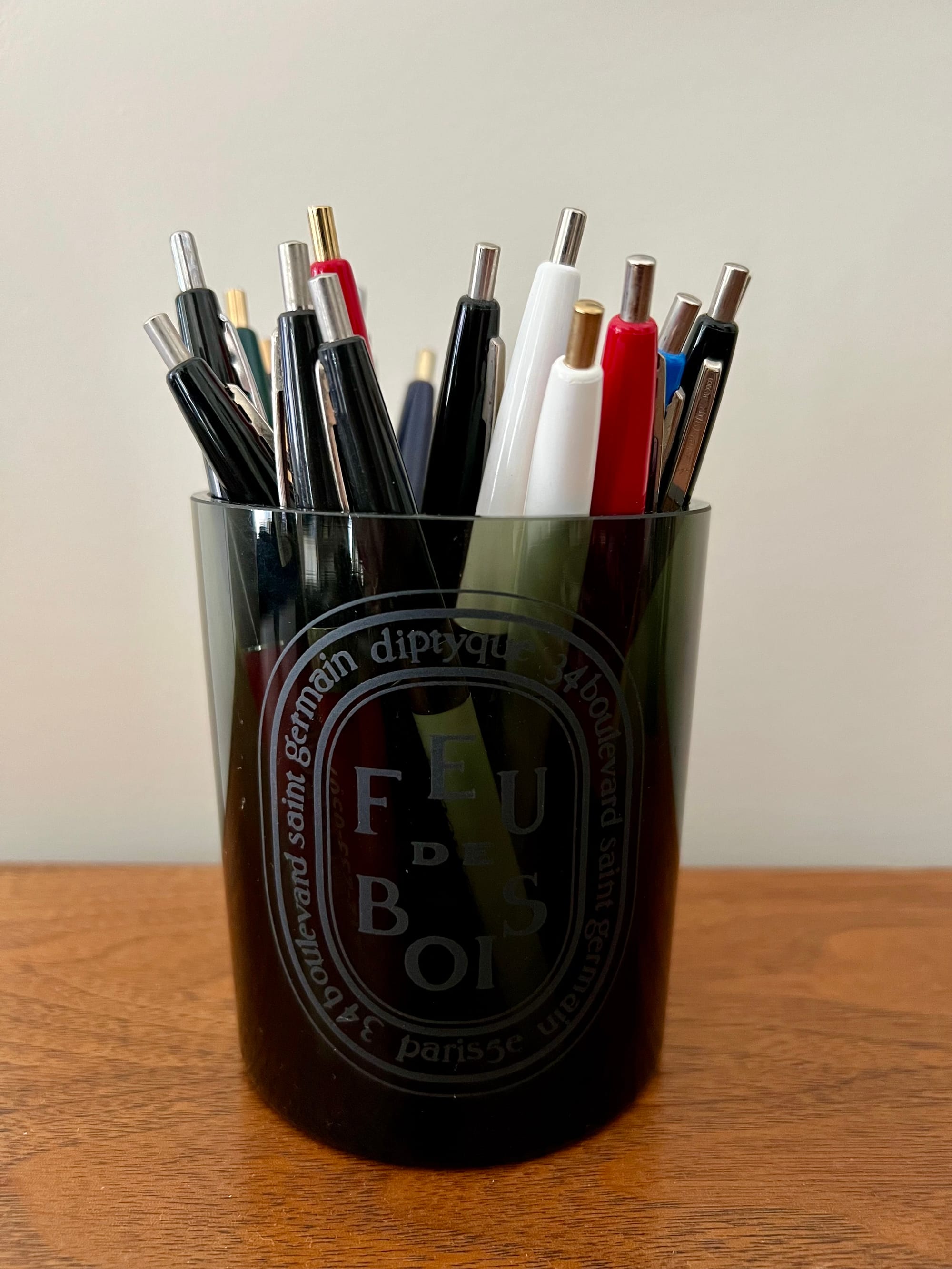 Almost comically simple, the pens have a two-part body that houses a retractable ballpoint cartridge, a svelte metal clip, and critically, a clicker that is immensely satisfying in both feel and sound. (I was once admonished by a former coworker for clicking too much.) The ink goes on dry, doesn’t pool or clot, and with a consistent application. Visually, I think the pens are an underrated design object, the embodiment of the “form follows function” mantra that gets tossed around in odes to mid-century Braun appliances or 1950s dive watches. You can imagine one peeking out of the pocket of a Bell Labs engineer scurrying down a hallway, a reliable instrument prized for its humility.